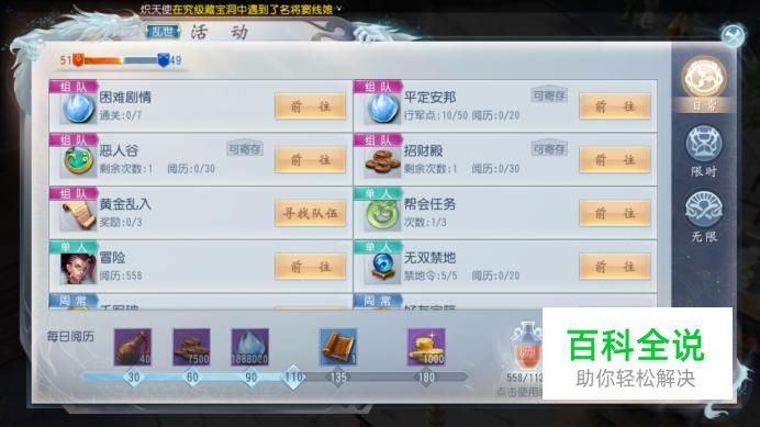 进入活动界面,选择“无双禁地”前往,每次需要消耗5个禁地令,每日最多获得20点阅历。