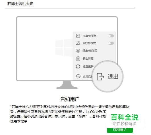 搜索引擎搜索“韩博士装机大师”,可在网站下载工具,下载后直接免安装打开,会提示关闭杀毒软件或防火墙。这是因为在重装系统过程中需要对系统盘进行修改,可能会导致误报。如果不想关闭,则在弹窗提示时点击“允许”。
