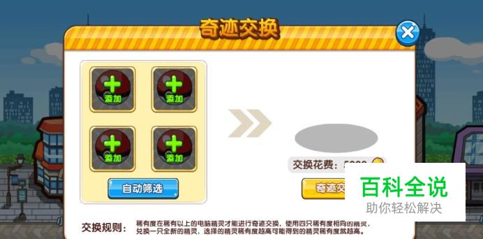 我们需要先知道的是,参与奇迹交换的精灵需要稀有度在稀有以上,并且使用四只相同稀有度的精灵能够交换一个新的精灵。