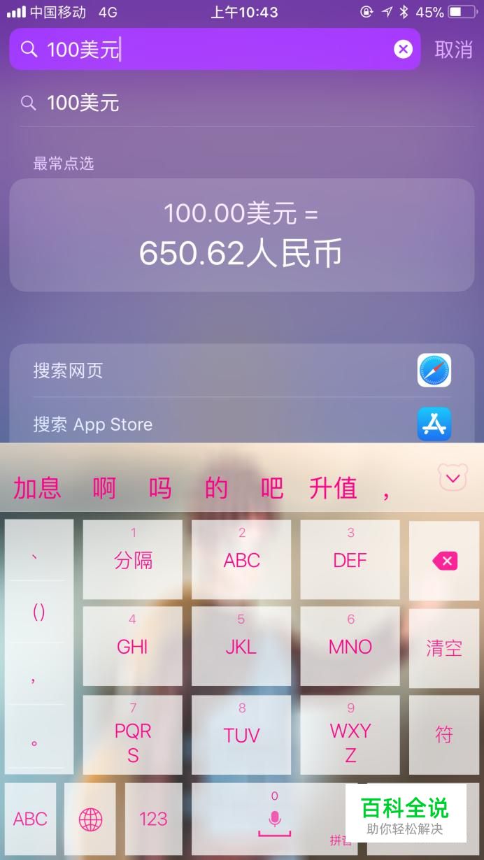 苹果搜索可当做计算器用。你只要键入计算公式就可以了。具体操作如下图。