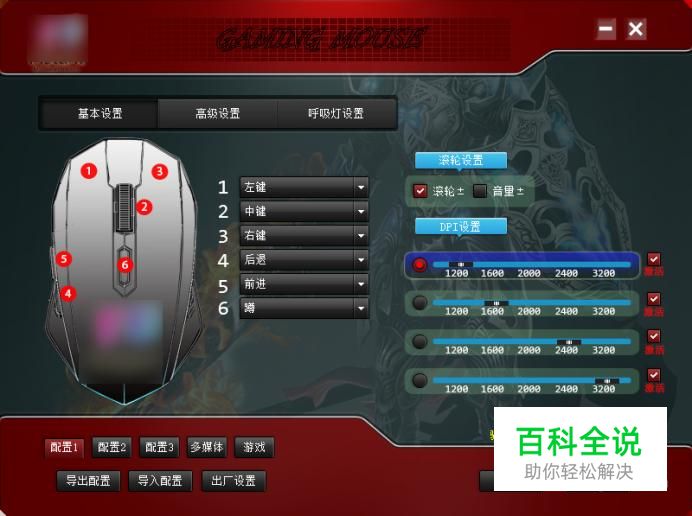打开鼠标的驱动软件,界面如下 一般鼠标的特殊键都配置了不同的功能,可以挑选一个配置。