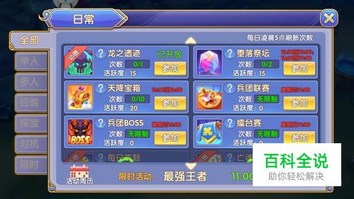 进入活动中,在列表中点击“龙之遗迹”参加,每日可参加1次,完成后获得15点活跃度。
