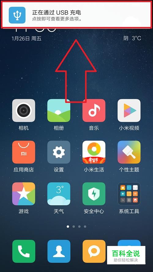 首先我们将数据线的两端分别插在电脑和手机的USB接口上,如果是小米手机的话,这时手机上方就会弹出一个“正在通过USB充电”窗口,然后我们点击这个窗口。