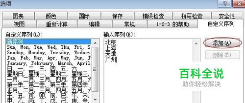 打开菜单栏的“工具”-->选项,然后在弹出的“选项”窗口中选择“自定义序列”,在右边的“输入序列”中依次输入北京、上海、天津、广州,每输入一个地点时,就回车一次,输入完成后点击“添加”按钮;(如图)