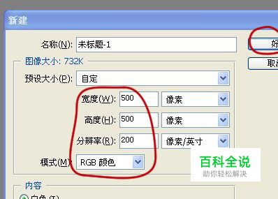 新建一个页面(ctrl+N) 用红色圈起来的地方数字可以自己填的,想填多少就我少,但那个分辩率两百以上比较清楚,模式请选:RGB色 最后点击: 好 就OK了。