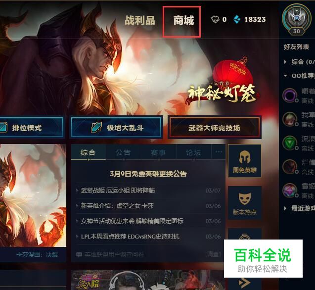 首先,我们使用QQ号码登录并打开LOL游戏界面,点击游戏界面中的“商城”菜单选项。