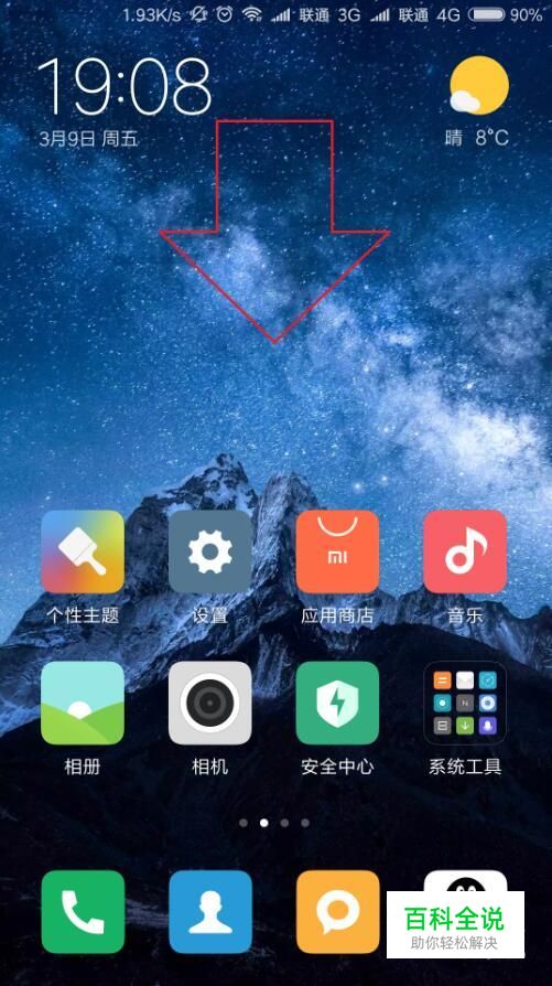 首先,我们打开MIUI系统主桌面,在桌面中向下滑,打开手机快捷开关栏目。