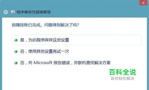 测试程序兼容性 如果程序正常运行,那就选择“是,为此程序保存这些设置”。如果程序依旧故障,那么选择“否、使用其他设置再试一次”继续测试,或者向Microsoft报告错误并联机解决问题。