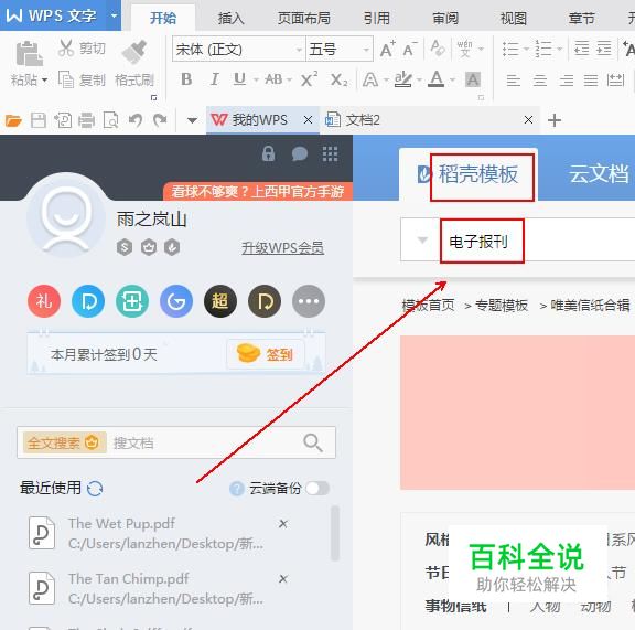 在“我的WPS”窗口“稻壳模板”中的搜索栏中输入关键词“电子报刊”。