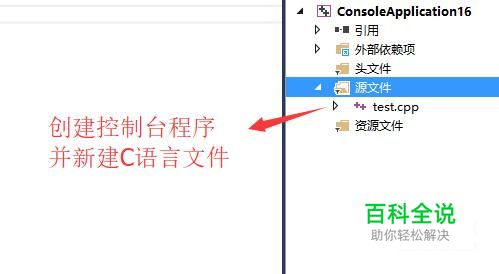 首先在Visual Studio中新建C语言项目,并且在源文件目录下面新建C语言文件,如下图所示
