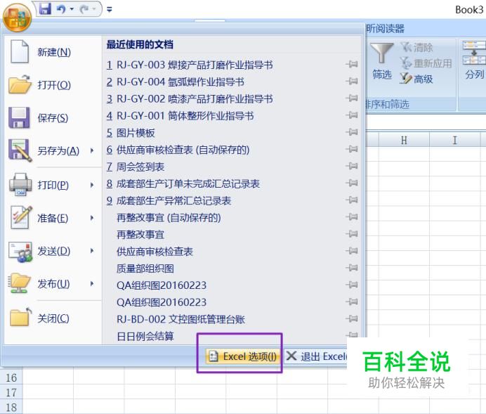 然后我们点击左上角的office按钮,弹出的界面点击Excel选项;