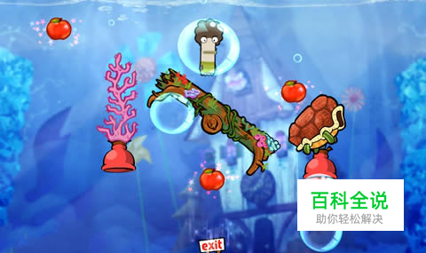 第三十五关:制造一个泡泡把木板向右倾斜,制造两个泡泡把右边的乌龟升起来;点击小鱼泡泡让小鱼落下,小鱼会通过右边的乌龟反弹到左边,过程中会收集两个苹果;在反弹到左边的时候要及时点击住小鱼,别让它跑出去了;接着点击小鱼泡泡让它落到左边的乌龟上,在落到乌龟前要快速在珊瑚底下制造泡泡让它升起来,这样当小鱼落到乌龟身上的时候,就可以直接反弹收集到最后一个苹果,并安全到达出口了。