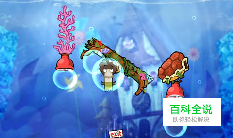 第三十六关:制造一个泡泡让右边的厕泵往上升,这样就可以把挡住出口的珊瑚移开;点击小鱼泡泡,它会通过乌龟弹跳收集到左边与中间的苹果,等收集完中间苹果弹跳起来后再点击小鱼,此时风会把小鱼吹到右边,此时点击小鱼泡泡就可以收集到最后一个苹果,再次弹跳起来到中间的时候点击小鱼让它顺利落下到出口。
