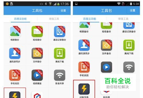两人都打开百度云,在工具包菜单中选择闪电互传;