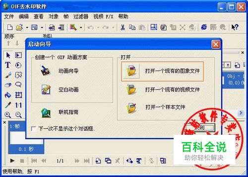 打开去“gif去水印软件”,在初始弹出的启动向导中,选择“打开一个现有的图像文件”,将带有水印的GIF动态图导入进来待编辑。我这拿一张带有水印的动态图做示范!