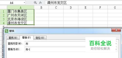 选中原表内容,按Ctrl+H键,调出替换窗口。如图,将“市”替换成“市-”。