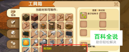 接着放置工具箱,之后点击工具箱会弹出“工具箱”对话框,点击常用按键后在常用页面选择鸡饲料。