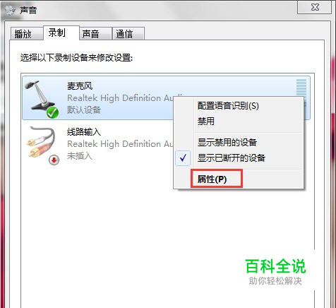 随后出现声音的控制面板,右键 麦克风 选择属性。