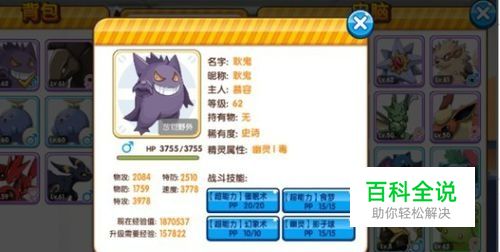 第二站:地道 白天18点以前,有机会遇到大甲,遇到率挺高的。 性格:孤独,固执,调皮(+攻击) 大甲主要种族值:125物攻,85速度 技能配置:劈开,地球上投,地狱滚动,剪刀断头台 作为最早能抓到的高攻宠物,特别是0元党,推图神兽 在王者遇到牛B的宠物,可以试试毽子棉睡眠+剪刀断头台(30%命中,命中必死) 携带等级至50级,后面速度和防御跟不上,基本仓库了。 NPC 第一个是狩猎场 每天任务奖励5张初级和2张中级卷,在低等级的时候获得好宠物的地方, 完全可以在低等级的时候获得:毽子草,小疯狗,小黑狗,海星星,鬼斯通,小拳石,凯西,腕力,火爆猴等主流宠物。 第二个是训练师商城,砖石的直接过,不用看。。挑战联盟商店只买整个技能。王者之路商店:进化石,蓝色玩偶碎片,其他不买。。精灵联盟商店,只买整个技能其他过。。。神秘商店: 蓝色玩偶碎片,进化石碎片,技能碎片 其他过 第三个是奇迹交换(48级开通),紫色精灵交换,其他的都放生。。。蓝色的不要去交换,太却蓝色玩偶了,扫荡划不来。。。 固定交换:其实就是神兽换性格的,其他没有什么用。。 第四 公会,每日帮别人升级2次精灵获得金币和别人可以帮自己升级2次精灵。。经验相当的高。 训练师职称,有砖有经验,每日投入10-20W 第五试炼 喵喵藏宝屋就不多说了,关键是精灵联盟试炼 前期一定要快速升级到54级,每日3次挑战能获得60个紫色的糖, 1个7500经验,精灵等级和人物等级一样高,打王者无压力的关键。。。 第六个训练, 能开几个就开几个,至于颜色呢根据手里的砖决定,不会亏,没有好宠物升级就放垃圾场,后期有新宠物的时候,把垃圾宠重置(200砖),直接获得大量紫糖。。。。来升级新宠物。。 6神兽之首:鬼斯通——耿鬼 所谓的6神兽是只:每个玩家必备的6只精灵。 接下来我们就到了紫苑镇,小精灵塔,晚上8点-10点,开始抓鬼,有螳螂(带刀背技能)。。这里我们要说明下,请在第一天晚上过6点在尼比市抓一只咕咕。。练到20+,带看破技能(幽灵系宠物物理免疫,看破命中后幽灵系将不在物免)。。。 抓捕过程, 毽子棉(速度1000+)睡眠+咕咕看破+螳螂刀背至1血,再换成萝卜头(毽子棉)睡眠+高级球+超级球+高+超+高+超+高+超,8个球必定抓住。。。 性格要求:胆小(+速度-物攻),急躁(+速度-物防) 说明下+速度就是速度是原来的110%,-物攻就是原来的90%,胆小的耿鬼的速度从原来的110变成121。 耿鬼主要种族值:特攻130,速度110。 培养要求,橙色+2名字(先到紫色名字),5X(先到4X) 技能配置: 睡眠, 梦食,幻象术,影子球,破坏死光,臭泥爆炸 ,同命,这些技能自己配都可以。 永远携带 ,PVP带头大哥,配道具 绑带或者爪子。