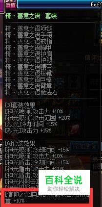 异界2期: 善意之语套装,【信仰之念】自身技能攻击力增加量+10%,首选五件部位为 手镯+项链+鞋子+腰带+魔法石。