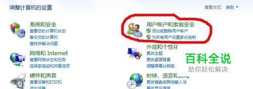 在控制面板中找到用户账户和家庭安全,选择这个选项进去。