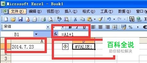 首先要展示一下判断日期或时间是不是真正的日期或时间的方法,如下图所示a1单元格中有一个日期,在b1中输入公式计算a1加上1的结果,如果是错误值说明a1单元格中的日期或者时间不是真正的日期或者时间,因为日期和时间的本质是数值,是可以参与数学运算的。