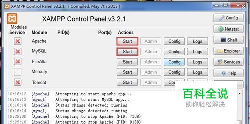 双击打开xampp-control.exe,会出现以下界面,点击开启Apache和MySQL,这样我们就开启服务了,之后我们可以通过图形界面或者DOS界面使用MySQL数据库,首先介绍DOS界面使用。