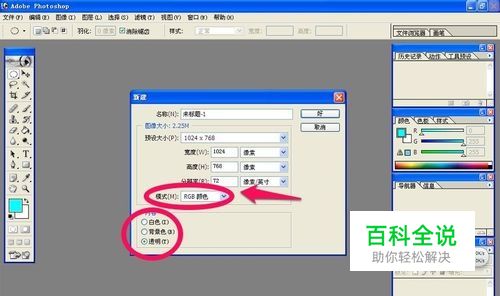 我们打开我们的photoshop软件,我们新建一个色彩模式为RGB模式,背景色为透明的图片!
