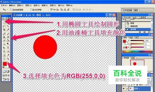 我们用椭圆选框工具首先绘制一个圆形,然后选择前景色为RGB(255,0,0)用油漆桶工具进行填充,出来的是一个纯红色的圆形!