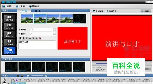 2、做片头 片头会体比赛主题和演讲视频的主题。点击“片头片尾”,选择“片头”输入文字,设置字体、大小、颜色等,然后选择片头出现的方式,将其拖拽到轨道栏即可。