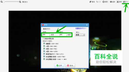 图片整体压缩 点击图片编辑区域右上角的【尺寸】按钮,在弹出的对话框中将原有图片的像素更改为800*600,注意一点,在更改像素的过程中,确保取消锁定长宽比例前边的对勾。