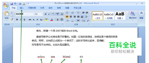 首先,新建一个用2007版的Word文档。 直接写数学公式肯定是不好看的。如图:红色的波浪线,说明这是个错误的英语单词(呵呵,文档把公式视为一个单词了);这和手写体比起来,显得略丑。还有很多数学符号是写不出来的,比如大型运算符、积分符号。