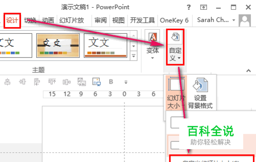 在菜单栏中选择 设计选项卡,选择最右边的 自定义栏 的 幻灯片大小,点击 自定义幻灯片大小。