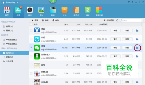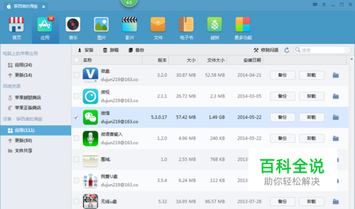 手机连接电脑,打开同步助手,点击上方‘应用’按钮。进入同步助手‘应用’界面,点击左面栏目‘应用’,找到微信。