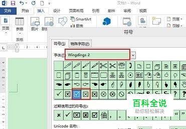 第二步: 1)在弹出的对话框中选择符号选项卡 2)在字体编辑框中选择“Wingdings 2” 3)选择要插入的 对错号。 4)选择“插入”