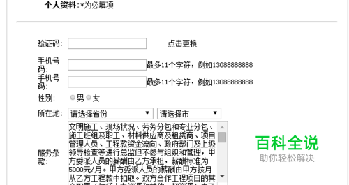 下图的表单就是书写后的样子。可以根据我全部书写的代码进行复制。就可以看到效果了。 <table cellspacing="0" align="center" bordercolor="#E4E4E4" cellpadding="0" border="1" height="800" width="800"> <tr > <td valign="top"> <table align="center" border="0" cellspacing="0" cellpadding="0" width="750"> <tr height="40"> <td width="150" align="right"><strong>个人资料:</strong></td> <td>*为必填项</td> </tr> <tr height="40"> <td colspan="2"><hr></td> </tr> </table> <table align="center" border="0" cellspacing="0" cellpadding="0" width="650" > <tr height="60"> <td width="70">验证码:</td> <td width="150"><input type="text"></td> <td width="50"><img src=""></td> <td align="left">点击更换</td> </tr> </table> <table align="center" border="0" cellspacing="0" cellpadding="0" width="650" > <tr height="35"> <td width="70">手机号码:</td> <td width="160"><input type="text"></td> <td colspan="2">最多11个字符,例如13088888888</td> </tr> </table> <table align="center" border="0" cellspacing="0" cellpadding="0" width="650" > <tr height="35"> <td width="70">手机号码:</td> <td width="160"><input type="text"></td> <td colspan="2">最多11个字符,例如13088888888</td> </tr> </table> <table align="center" border="0" cellspacing="0" cellpadding="0" width="650" > <tr height="35"> <td width="70">性别:</td> <td colspan="3"><input type="radio" name="uSex">男<input type="radio" name="uSex">女</td> </tr> </table> <table align="center" border="0" cellspacing="0" cellpadding="0" width="650" > <tr height="35"> <td width="70">所在地:</td> <td colspan="3"> <select style="width:200px;"> <option>请选择省份</option> </select> <select style="width:150px;"> <option>请选择市</option> </select> </td> </tr> </table> <table align="center" border="0" cellspacing="0" cellpadding="0" width="650" > <tr height="35"> <td width="70">服务条款:</td> <td colspan="3"> <textarea cols="40" rows="8">文明施工、现场状况、劳务分包和专业分包、施工班组及职工、材料供应商及租赁商、项目管理人员、工程款资金流向、政府部门及上级领导检查等进行总监但不参与组织和管理,甲方委派人员的薪酬由乙方承担,薪酬标准为5000元/月。甲方委派人员的薪酬由甲方按月从乙方工程款中扣取。双方合作工程项目的其余配置(包括人力资源和其他一切资源)由乙方按需要自主配置,但必须满足工程和业主的需要,所需一切费用由乙方承担。 三、经营和管理模式 1、双方合作工程项目受甲方统一管理,可以采取灵活的经营策略和管理模式,但总体管理方式不能与甲方的管理原则相违背,同时必须遵守甲方的各项规章制度。 2、乙方作为独立核算实体,自主经营,并对合作工程项目的生产经营活动和经营成果承担责任;甲方仅对双方合作工程项目的各种合同、财务、质量、安全、工期、进度、文明施工、现场状况、劳务分包和专业分包、施工班组及职工、材料供应商及租赁商、项目管理人员、工程款资金流向、政府部门及上级领导检查等进行总监但不参与组织和管理。乙方在经营中必须遵守甲方的整体经营方针和政策,不得损坏甲方的市场形象。 乙方应按国家税收政策及财务法规的规定缴纳本工程税金。双方约定在现有政策下,本工程缴纳的管理费及税金为结算总造价 6.5%。若国家税收政策或财务法规发生修改或变化时,甲方提前通知乙方,乙方需无条件支付国家规定税收增加部分。甲方按实际发生额代收代缴政府部门要求交纳的各种保证金、基金和规费及在本项目合同所发生的技术服务费、印花税等,费用均由乙方自行负担。同</textarea> </td> </tr> </table> <table align="center" border="0" cellspacing="0" cellpadding="0" width="650" > <tr height="35"> <td width="70"></td> <td colspan="3" style="color:#8E0002">甲方提前通知乙方,乙方需无条件支付国家规定税收增加 </td> </tr> </table> <table align="center" border="0" cellspacing="0" cellpadding="0" width="650" > <tr height="35"> <td width="70"></td> <td colspan="3" style="color:#8E0002">甲方提前通知乙方,乙方需无条件支付国家规定税收增加 </td> </tr> </table> <table align="center" border="0" cellspacing="0" cellpadding="0" width="650" > <tr height="35" align="center"> <td colspan="4" style="color:#8E0002"><input type="submit" value="我接受条款"> </td> </tr> </table> </td> </tr> </table> 把这些放在body中反复看一下。就懂得表单代码的书写了。