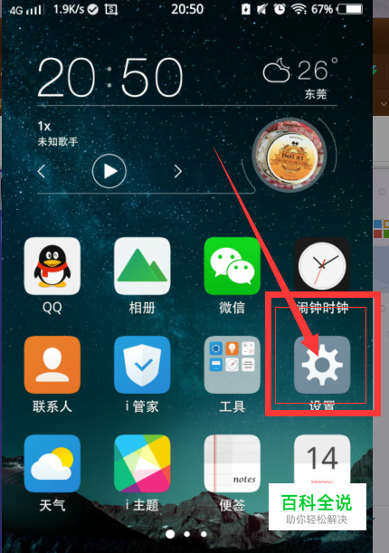 开始: 打开手机页面,找到设置那里。如下图的箭头指示方向——“设置”