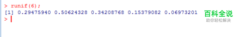 第一步,调用runif()函数,这时函数内的值为6,生成6个随机数,如下图所示: