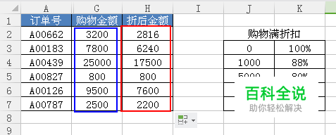 2.在空白单元格中编辑“购物满折扣”(注意“购物满折扣”的数据必须按照升序排列)。如下图