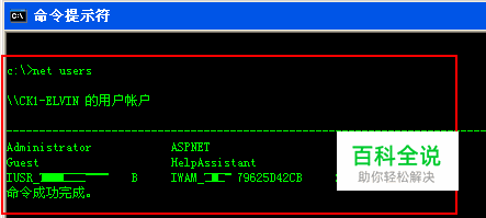 查看帐号。我们再输入“net users”命令查看本地的所有帐号。可以看到,已经没有刚刚删除的“test”帐号了: