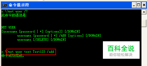 添加帐号。在打开的命令提示符窗口中,输入“net user test test123 /add”命令并按回车。当显示“命令成功完成”时则表示已经成功通过命令添加一个名叫test的本地帐号了: