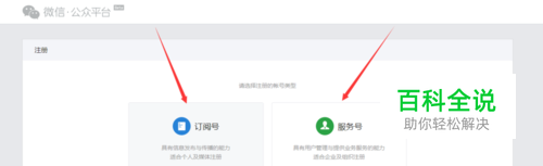 首先在微信公众平台注册一个微信公众号账号。微信公众平台的地址是:https://mp.weixin.qq.com/,点击右上角的注册,然后选择“订阅号”或者“服务号”。