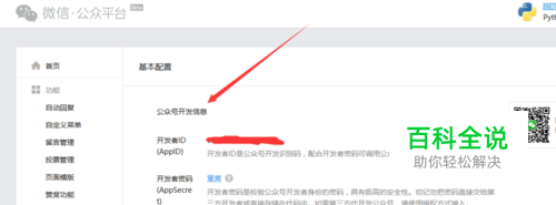 在新页面的上部,有“公众号开发信息”部分。这个部分可以看到AppID和AppSecret。其中AppSecret的查看需要点击“重置”或者“查看”链接。查看后要记得把AppSecret在其他位置记录下来,因为AppSecret只能查看一次,后续无法再次查看了。另外,需要设置IP白名单,需要设置的内容请咨询开发团队,由开发团队提供。