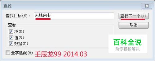 我们也可以在打开注册表后,点编辑--查找,输入软件名称,就能找到我们安装的软件的注册信息。如:我们要查找 无线网卡的信息: 打开 注册表- 编辑- 查找- 输入: 无线网卡- 查找下一个,就可找到无线网卡的信息。