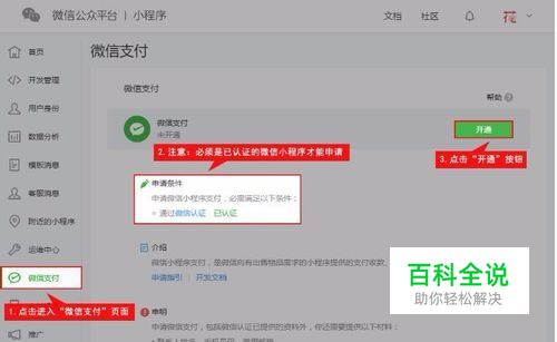 前往微信公众平台,登录您的小程序账号,进入微信支付页面,点击开通进行申请。注意:只有已通过验证的小程序才能申请微信支付。