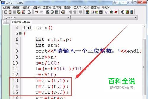 定义5个整型变量,保存输入的整数、整数的百位、十位和个位,以及各个位的3次幂和。