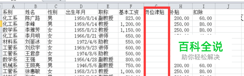首先打开excel文件,下面我们要做的就是将津贴这一栏批量的修改成50元,这个一共只有20多项,还可以一个个修改,但是如果有几百项的话那就麻烦了。所以要批量修改。
