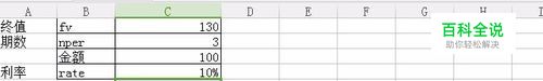 在现值这里输入-现值,点确定输入的是期初的100元,按10%复利三次的终值。