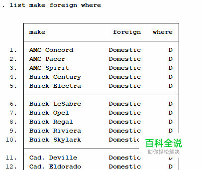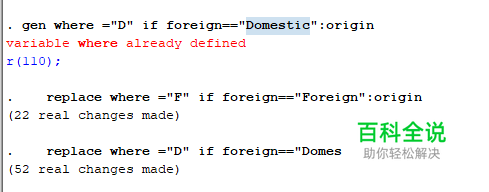 gen where ="D" if foreign=="Domestic":origin replace where ="F" if foreign=="Foreign":origin 如果foreign的值为domestic则where的值为D,否则where的值为F