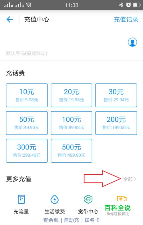 点击充值中心,进入到充值中心页面,这里默认是你的支付宝绑定的手机号码的话费充值页面,找到更多充值功能,如图
